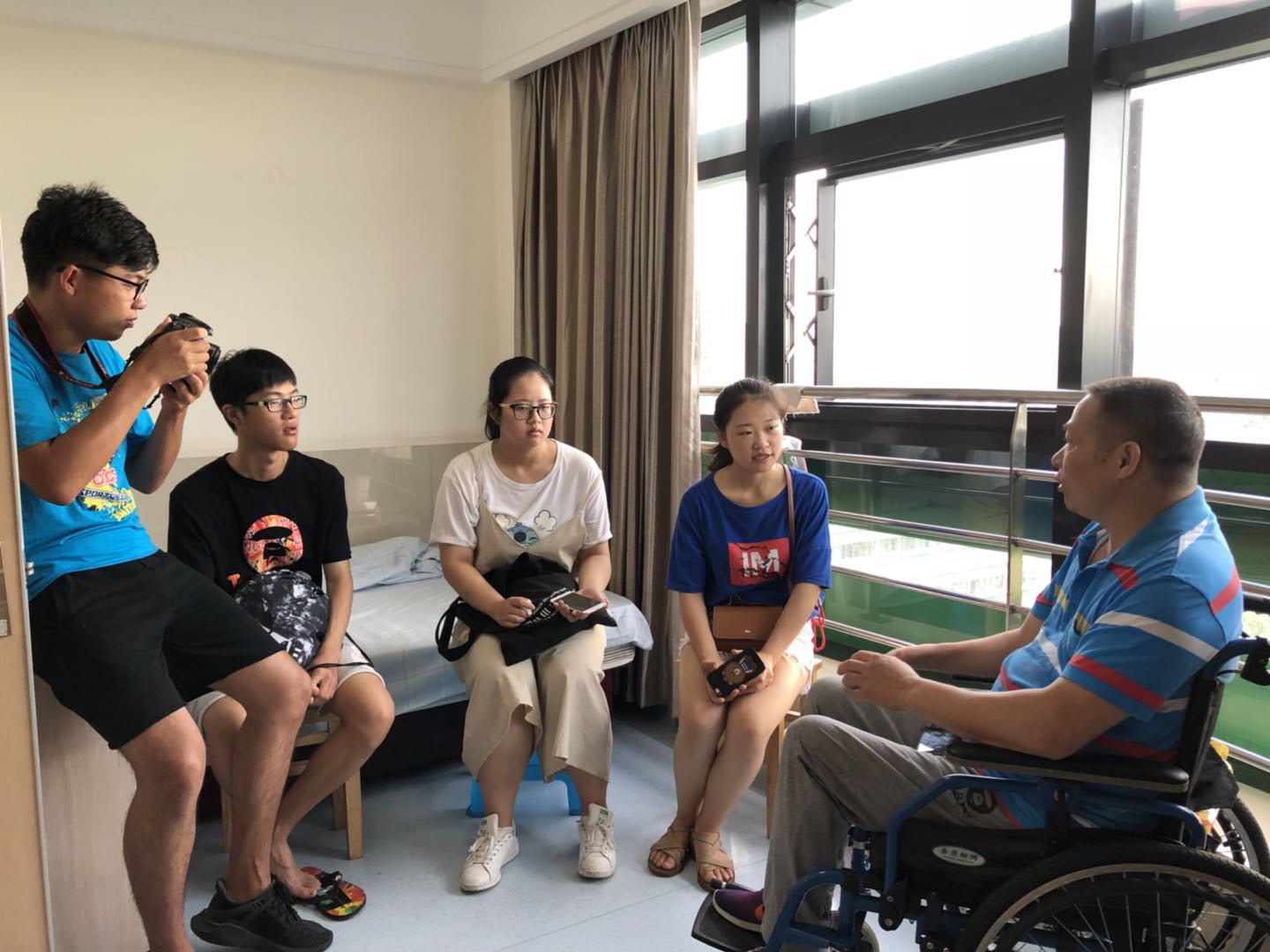 723日上午,來自嘉興學院義工站的四位志愿者來到浙江省榮軍醫院(嘉興市第三醫院),圍坐在榮軍胡映芳周圍,聽他講述自己與病魔、與命運不斷斗陣的頑強故事。