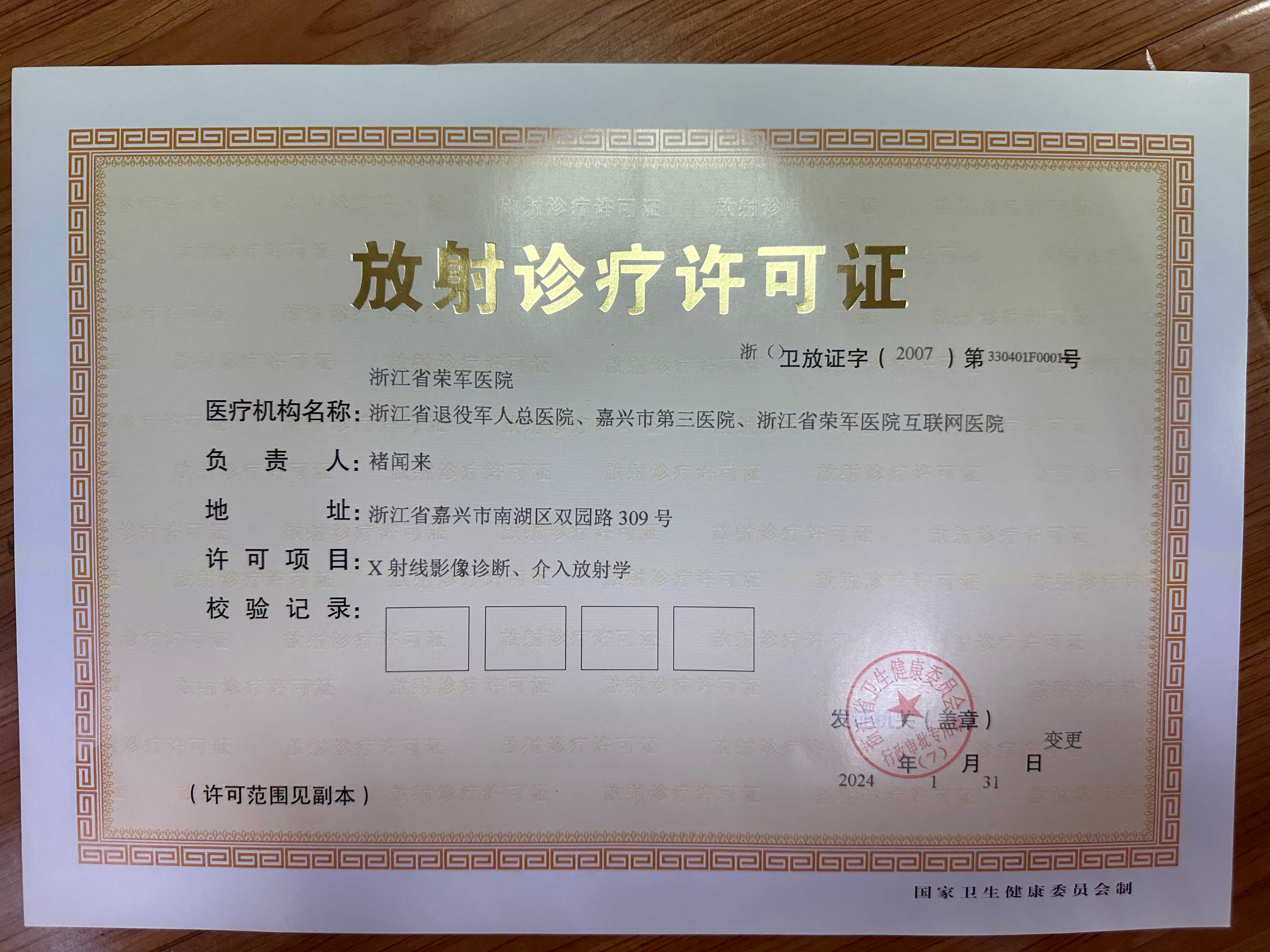浙江省榮軍醫院放射診療許可證書